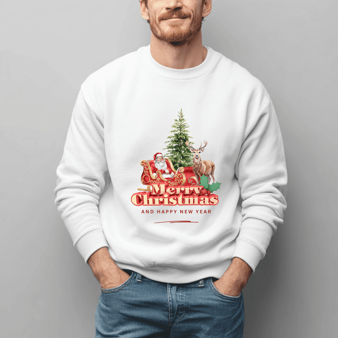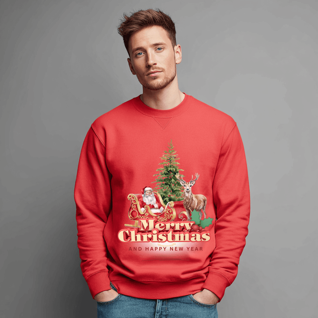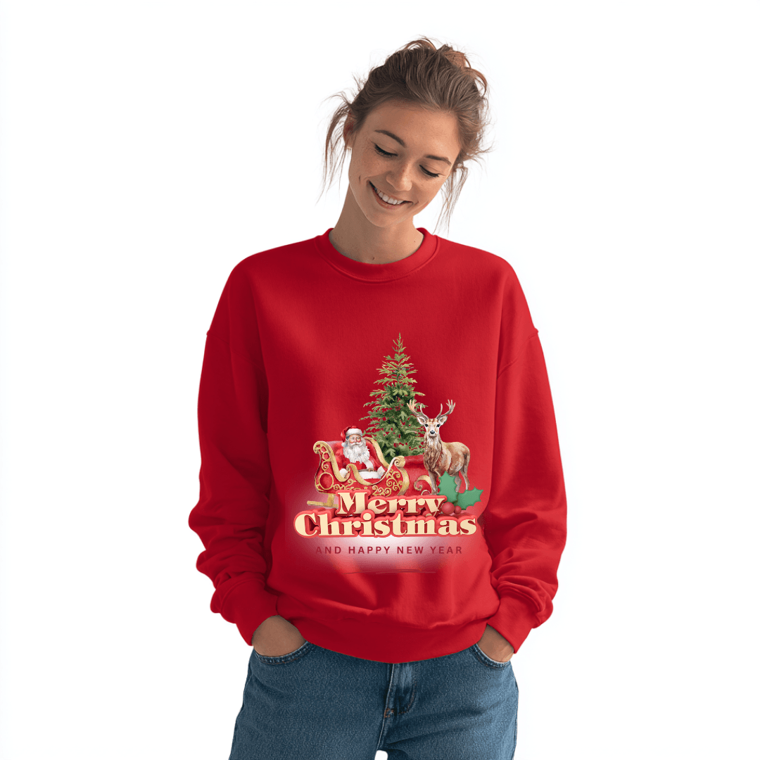 Add a touch of fun and festive charm to your winter wardrobe with our Cute Merry Christmas Sweatshirt, featuring an adorable illustration of Santa, a playful reindeer, gifts, stars and festive icons. This cheerful design is perfect for anyone who loves bright, colourful and joyful holiday outfits.