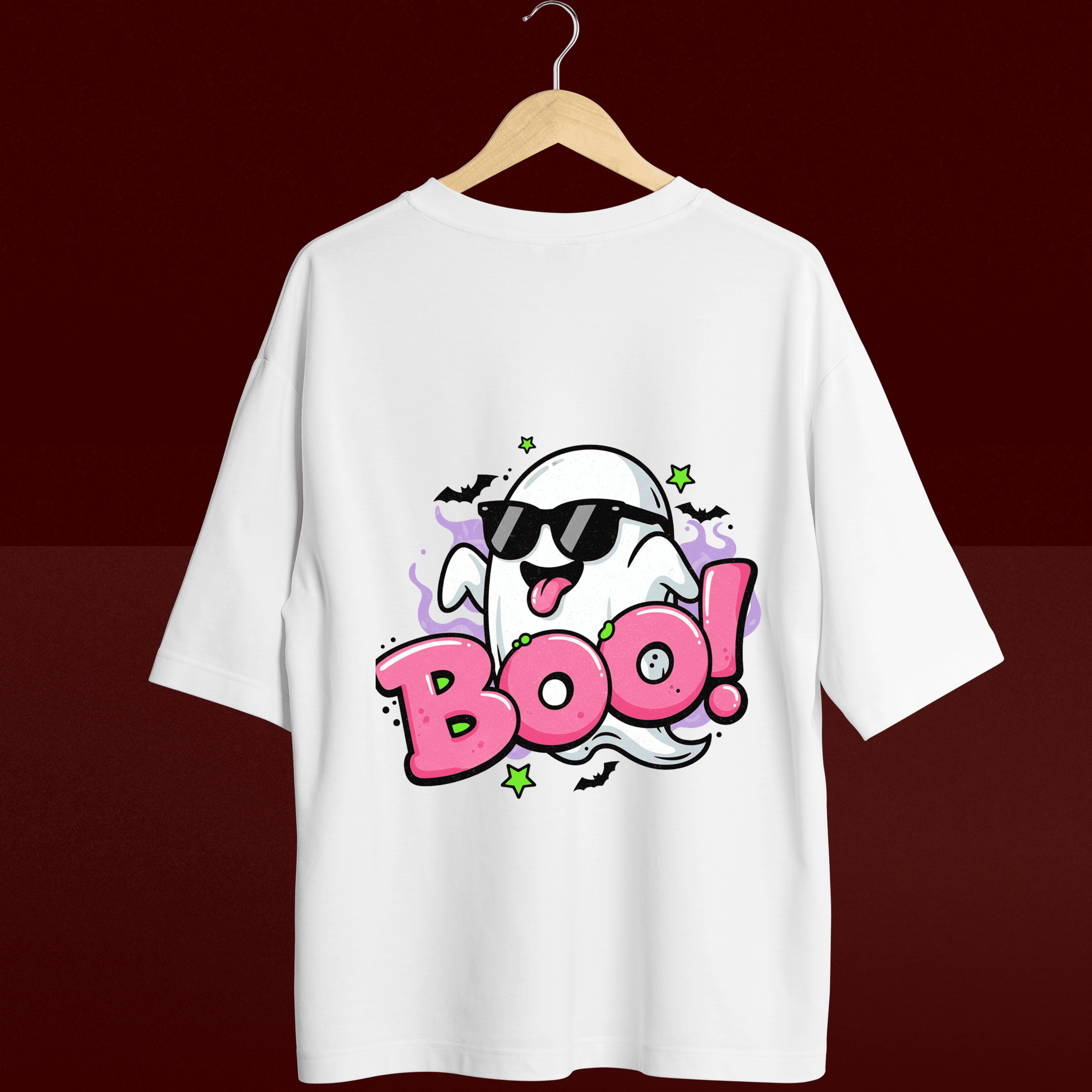 Charming Design: Showcases a unique and cute ghost graphic with cool sunglasses and vibrant "Boo!" text – a delightful twist on classic Halloween themes.