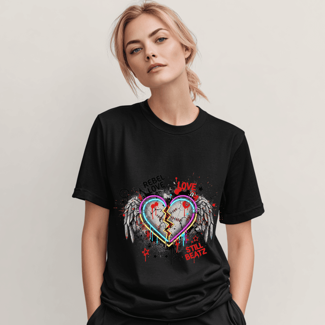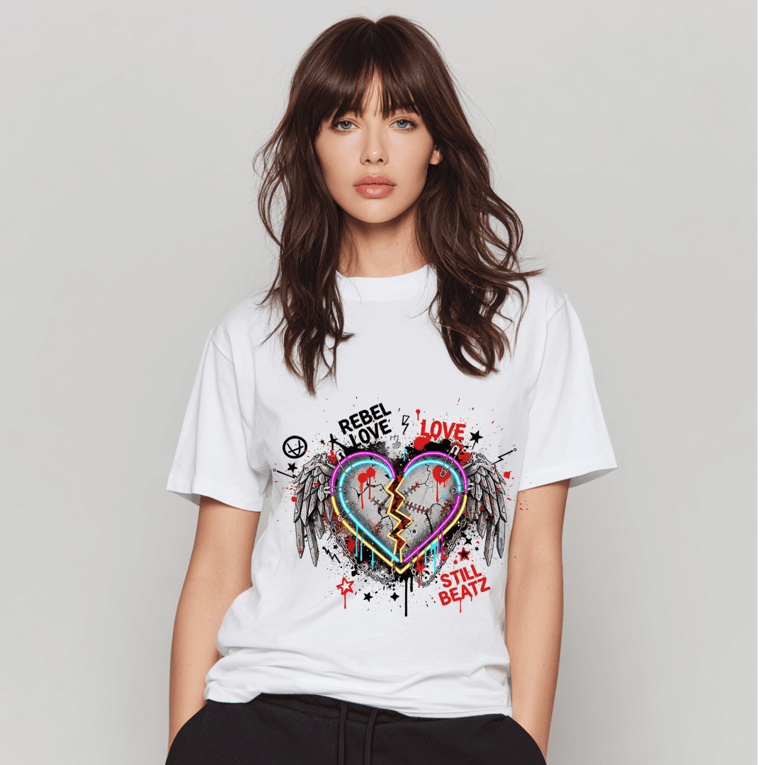 Turn heartbreak into power with this neon shattered heart streetwear T-shirt, featuring bold winged artwork, paint splashes, grunge text and glowing neon edge details.