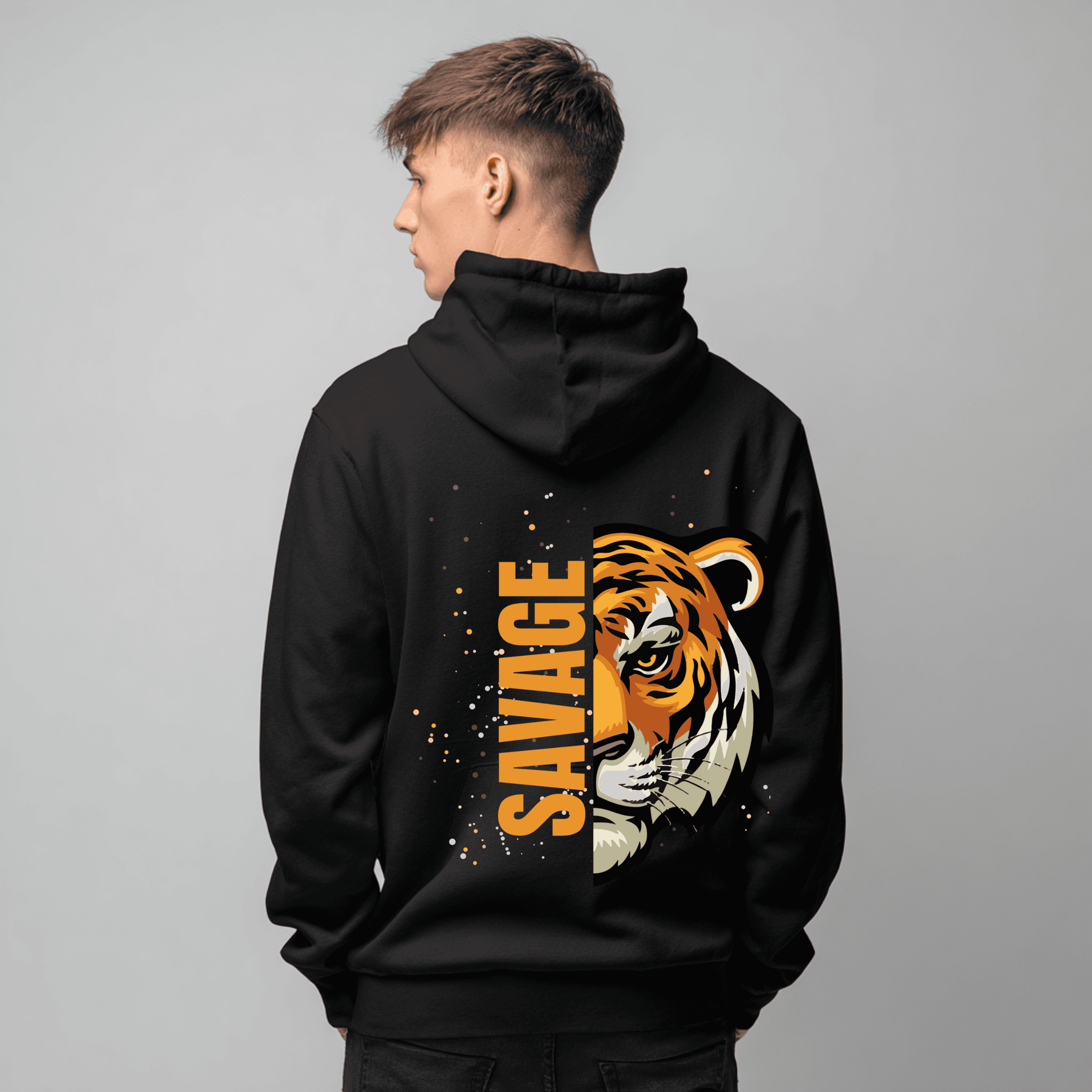A fierce tiger graphic spans the back, split by the bold vertical “SAVAGE” text, creating a dynamic, eye-catching statement that demands attention. Slight speckle details around the image add artistic flair and depth, ensuring every detail pops.